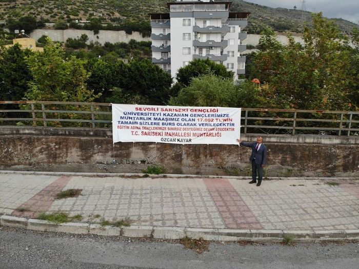 Hatay’ın İskenderun ilçesinde Sarıseki Mahalle muhtarı Özcan Kayar (58), muhtarlık maaşını öğrencilere burs olarak dağıtacağını mahallesine astığı afişlerle duyurdu.